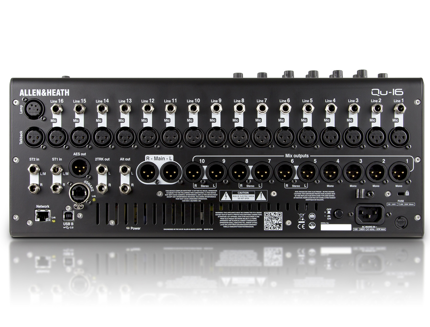 Qu-16配备了 5 核的高效 ARM 内核处理,触摸屏显示和界面、USB 流、Qu-Drive 多通道 USB 录音 / 播放,以太网和推子自动化均设有专门的 ARM 内核运行。在它们之间,ARM 内核提供最先进的处理,并行运行实现广泛的控制,进行即时操作和迅速响应。调音台中所使用的DSP开创了新一代的双核DSP,具有10个DSP核心,其中8个是专门用于通道和混音处理。内涵如此强大的DSP能力,通道处理仅占用了一小部分处理能力,因此Qu-16可适应未来的扩展需求,有足够的空间用来升级或者增加额外的功能。Qu-16 DSP架构采用可变位深度,为特殊的算法调整,48位用于关键的均衡功能,56位累加器用于极其有必要的混音总线,让音频中的每一点细微差别都能够在最终混音中捕捉到。
