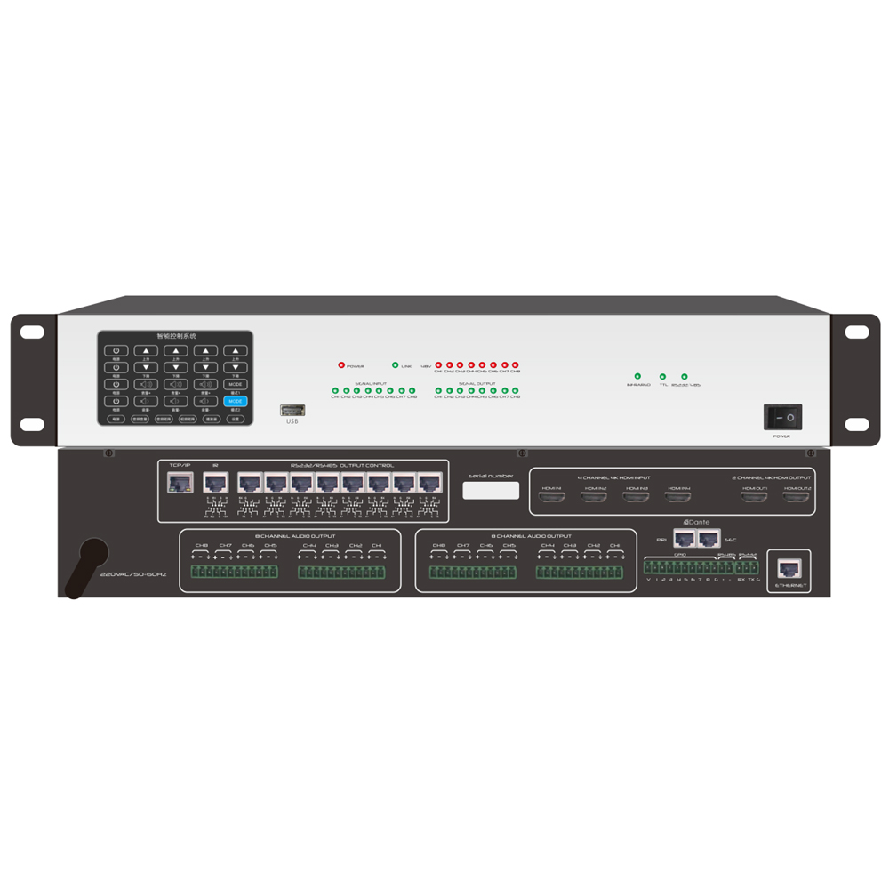 支持4.3寸触摸屏,10路中控接口,8路音频输入8路音频输出,4路视频输入2路视频输出,内置4路DANTE输入,4路DANTE输出